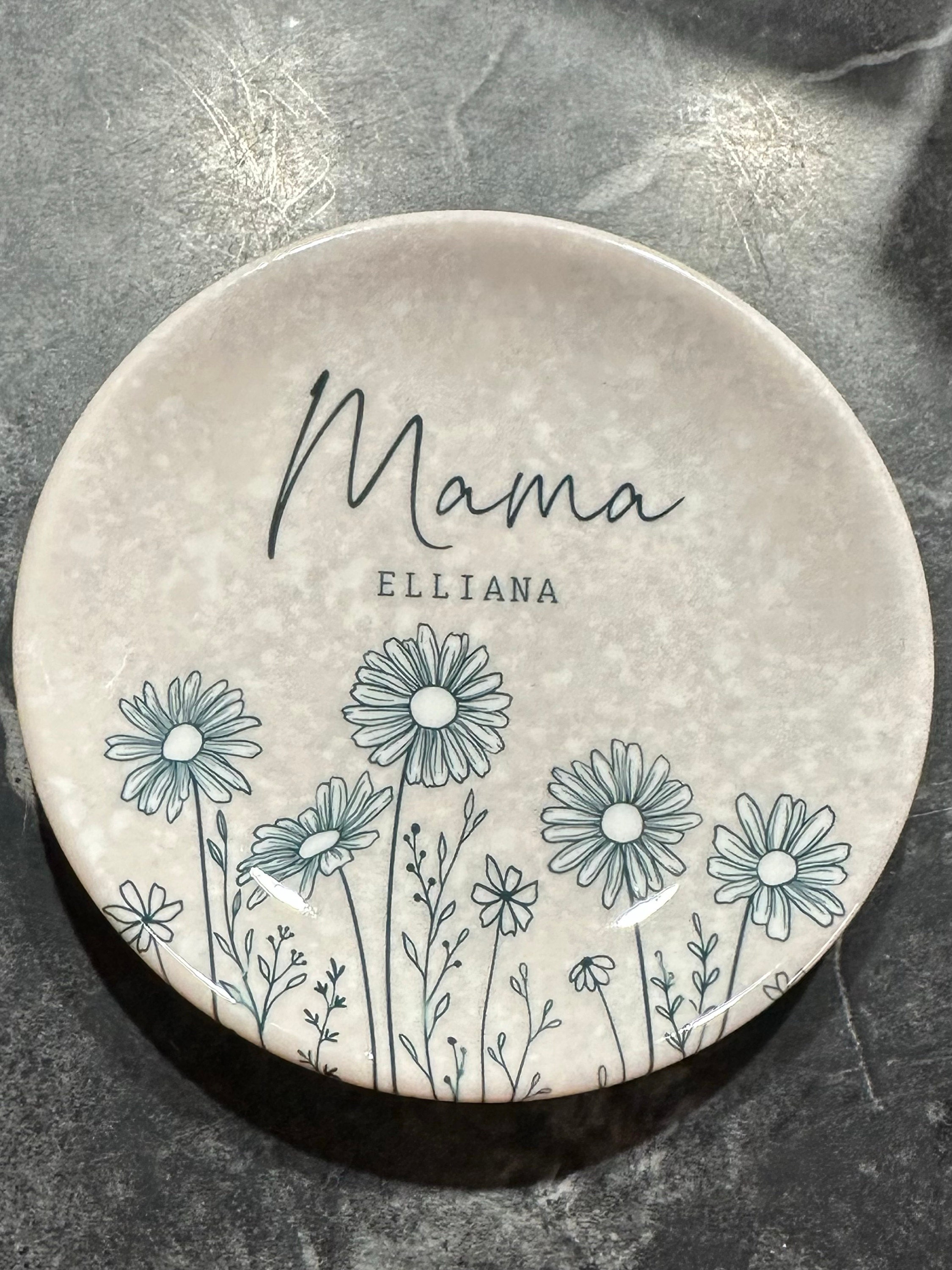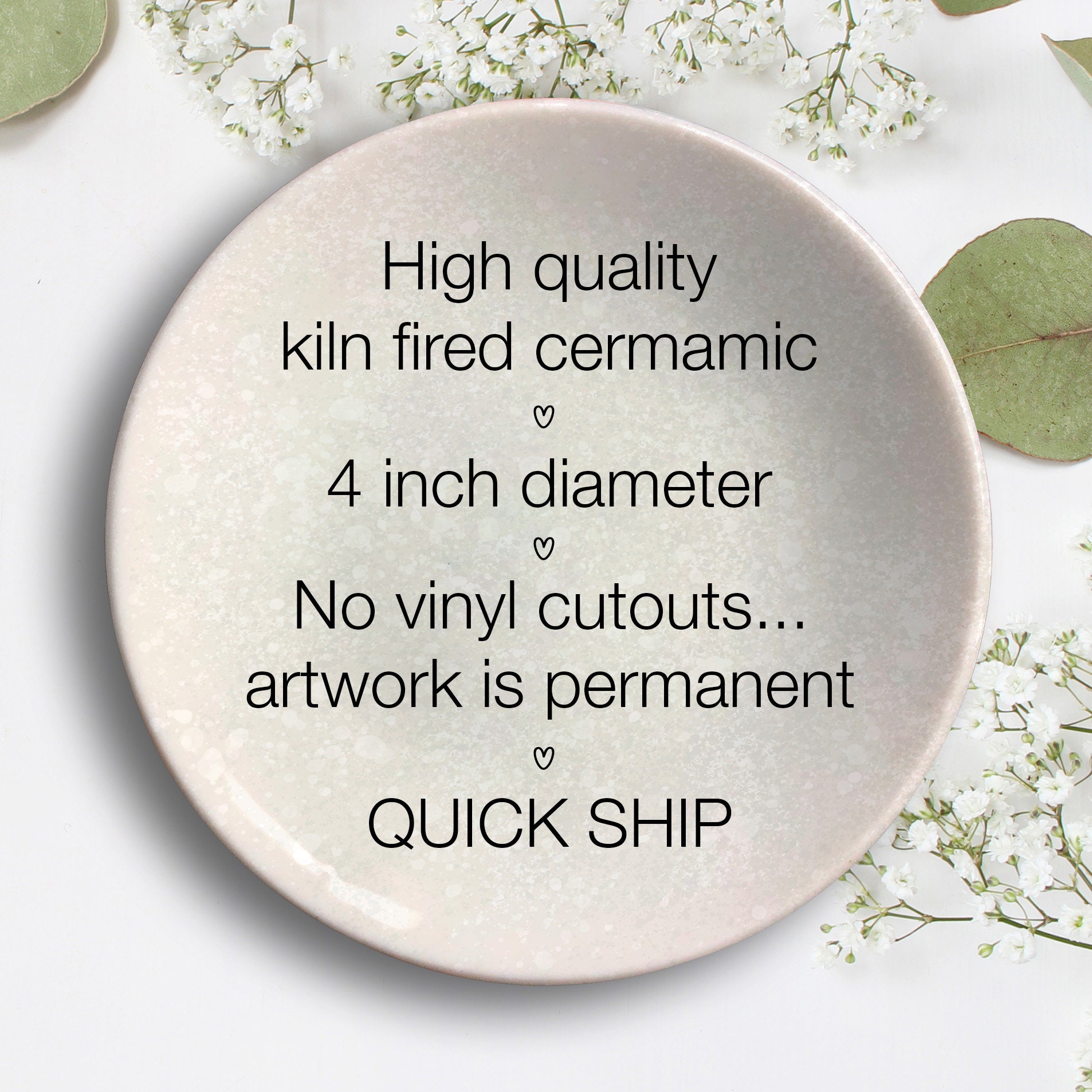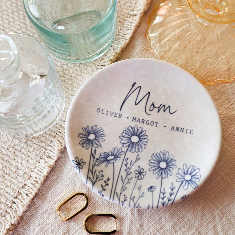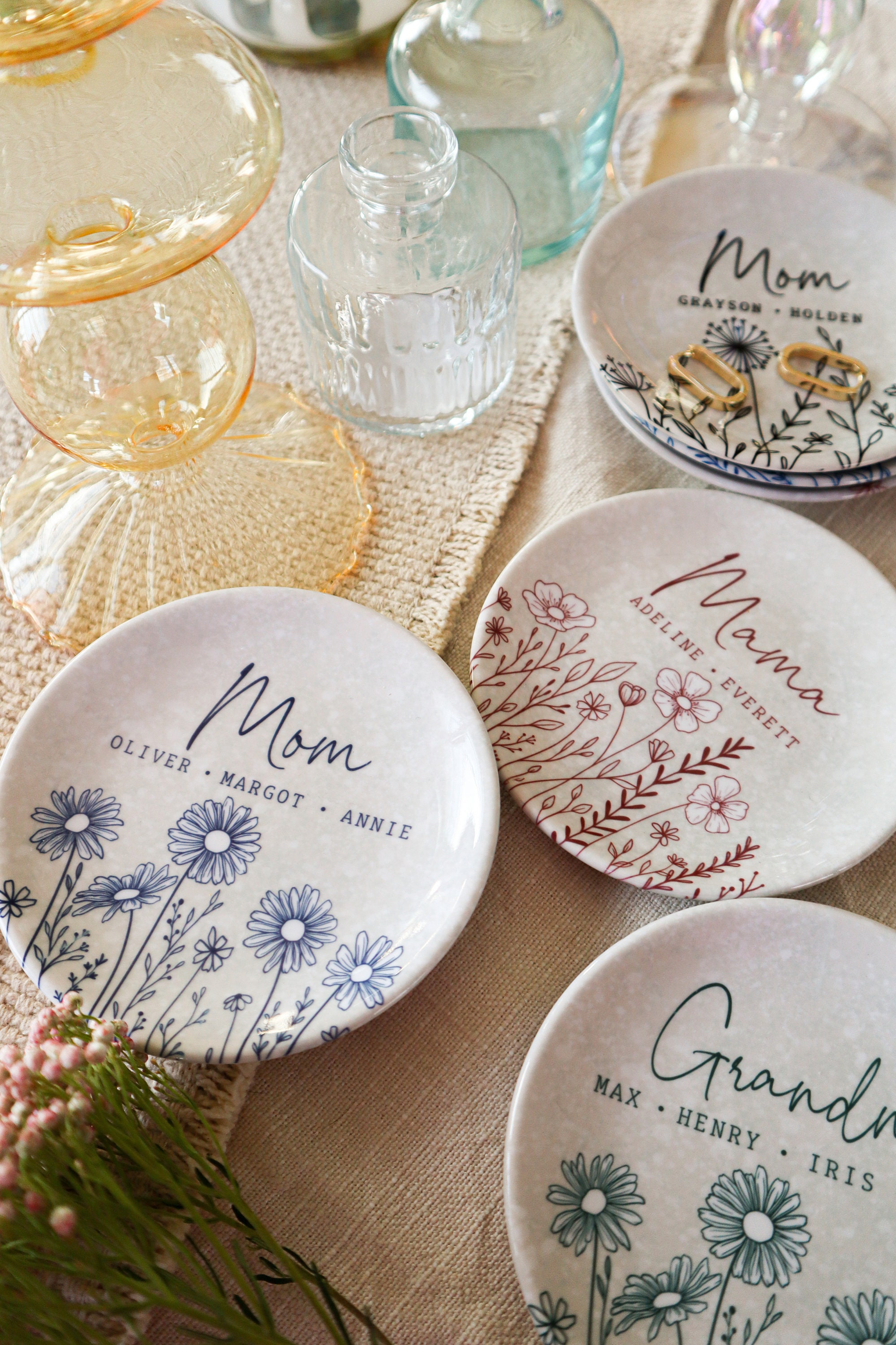 Personalized Wildflower Ring Plates are the perfect gift for Mom, Grandma, and new moms. Our ceramic jewelry plates are high quality and instantly become heirlooms. You can personalize your ring plate with names, titles, colors, and wildflower patterns. Each ring plate is fired in our studio kiln in Pennsylvania.