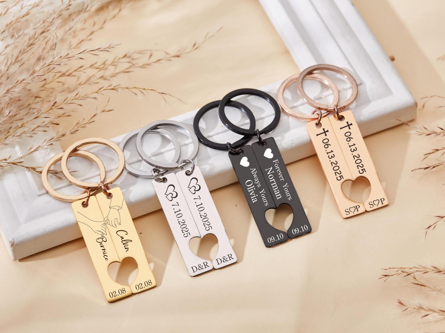 Personalized Engraved Heart Keychain Set,Couple Keychain Set Heart,Engraved Date Keychain,Wedding Date Keyring,Anniversary Gift,Gift for Him