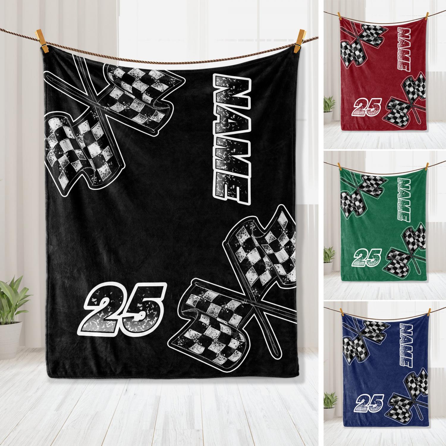 Personalized Racing Blanket, Custom Name Number Soft Cozy Sherpa Fleece Throw Blankets, Sport Gift for Racer, Dad, Son, Boy, Kid, Team