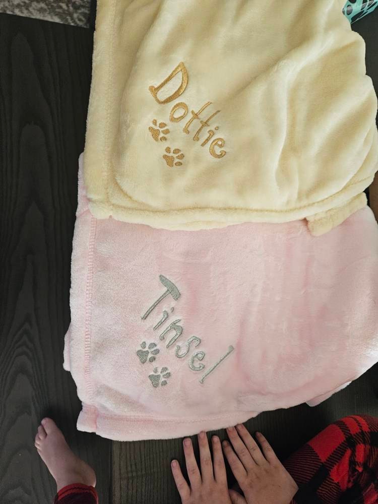 This blanket comes just like pictured with your pets name and two paw prints below the name.