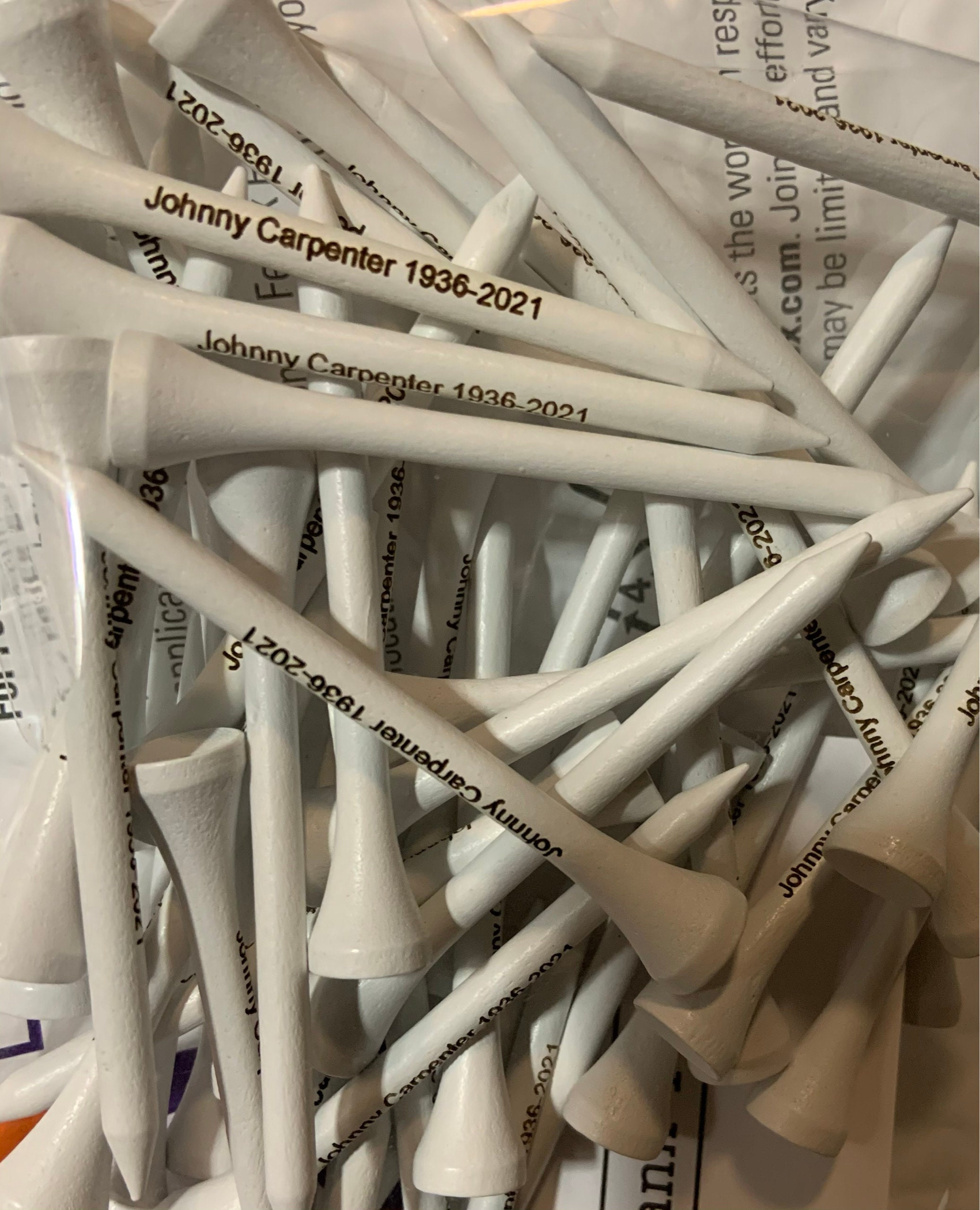 This listing is for custom laser engraving of one line of text (up to 25 characters including spaces) on each of the 25 white golf tees in your choice of fonts and tee color. Tees arrive in small, clear, resealable bag. The font color is always a dark brown/black and can not be altered.